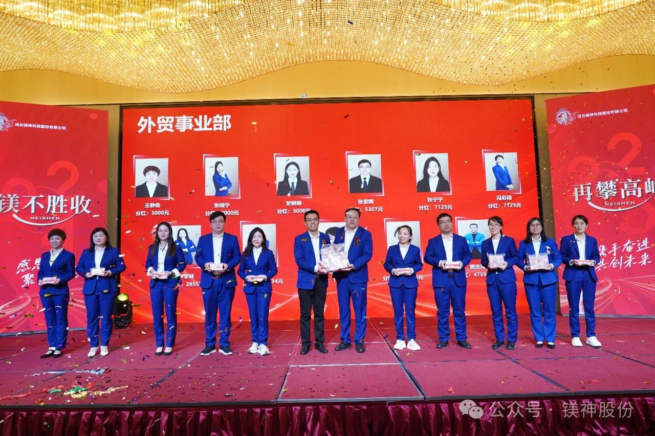 3月31日,河北鎂神科技股份有限公司2024年度總結暨表彰大會在邢臺市瑞爵酒店舉行,本次共發放獎金1227.88萬元!其中第四季度提成138.34萬元、銅級榮休紀念獎0.67萬元、私欠清零4.3萬元、評優評模76.8萬元、特殊貢獻獎18萬元、優秀團隊11萬元、專項獎金179.64萬元、職能中心年終獎72.84萬元、利潤中心分紅698.3萬元、扎根非洲、熱愛非洲、建設非洲獎28萬。