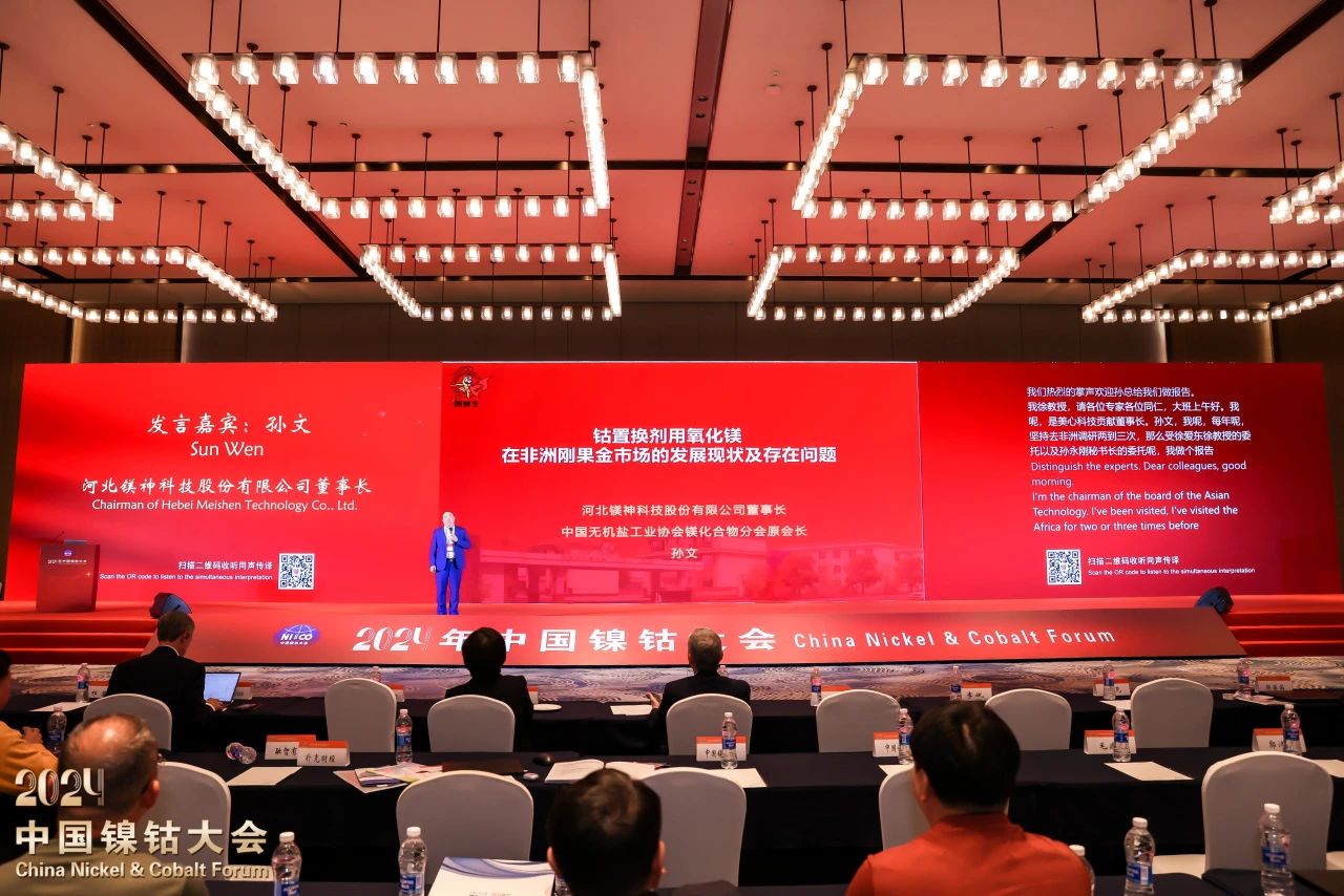 在這場聚焦“以新質生產力激發鎳鈷行業高質量發展新動能”的盛會上,河北鎂神科技股份有限公司董事長孫文先生作為嘉賓受邀出席并發表了題為《鈷置換劑用氧化鎂在非洲剛果金市場的發展現狀及存在問題》的主題報告,為與會者帶來了深刻洞察與前瞻思考,贏得了現場陣陣掌聲。