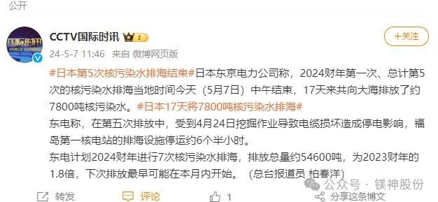 根據(jù)東電公布的近期計劃,2024年度擬分7次排出5.46萬噸核污染水,是2023年度的約1.7倍。日本國內(nèi)外民眾持續(xù)抗議核污染水排海,但日本政府和東京電力公司無視民眾怒火,執(zhí)意排污,引發(fā)廣泛擔憂。多家日本企業(yè)(如:日本神島化學有限公司、日本協(xié)和化學工業(yè)有限公司、日本富田制藥株式會社、日本宇部株式會社、日本達泰豪化工工業(yè)株式會社等)正在使用被核廢水污染的海水生產(chǎn)鎂鹽產(chǎn)品(如:碳酸鎂、硫酸鎂、氫氧化鎂、氧化鎂等)的事實引起了人們的關(guān)注。